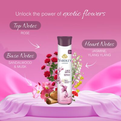 Yardley London Lace Satin Perfumed Deodorant Body Spray| Fresh Floral Scent| 90% Naturally Derived| Deo Spray| Body Deodorant for Women| 150ml