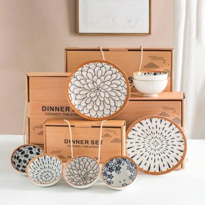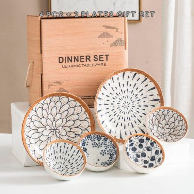 6-piece Japanese-style porcelain dinner set with 4 bowls and 2 plates. Lightweight, durable, microwave-safe, dishwasher-safe, and perfect for lunch, dinner, and gifting.
