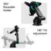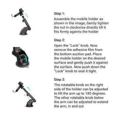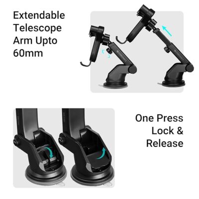 Its 60 mm extendable telescopic arm and strong suction cup ensure a firm, stable hold on the dashboard or windshield, even on bumpy roads.