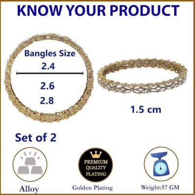 Celebrate elegance and timeless charm with this exquisite bangle set from ZENEME. Featuring a rich gold-plated finish and beautifully studded with sparkling white Kundan stones, these bangles are designed in a graceful floral pattern that instantly elevates your style. The intricate craftsmanship and dazzling accents make this set perfect for weddings, festivals, parties, and special occasions, while the classic design complements both traditional ethnic wear and contemporary outfits. Comfortable to wear and lightweight, this set of 2 bangles adds a radiant touch to your jewellery collection and makes a thoughtful gift for girls and women who appreciate stylish and elegant accessories.