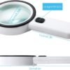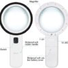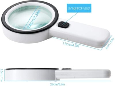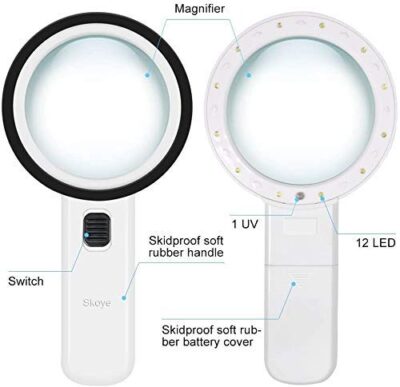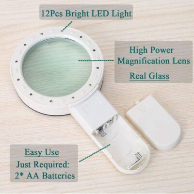 The ergonomic handheld design includes a raised switch button for easy operation, even for seniors or individuals with finger arthritis. Powered by 2 AA batteries (not included), the magnifier can also be used without lights when needed.